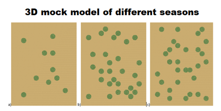OBSERVATION : : Mainly two assumptions made for the construction of mock forest 1) The surface is Lambertian in nature, 2) Canopy structure of all collected trees are homogeneous. DART simulation editor window is used in software to give inputs. Flux tracking, a default radiative method is selected, and the Analytic method is selected as a method for transferring radiation between Top of Atmosphere (TOA) and Bottom of Atmosphere (BOA). Four spectral bands representing Blue, Green, Red, and near infrared (NIR) bands at mode R are given as Flux-tracking parameters. Aerial view and terrestrial views of mock forest were created along with images of different bands (red, green and blue) and composites (FCC and TCC). 3D DART model is a very useful method to construct mock forest if we have data about biophysical measurements and the location of trees in a plot.